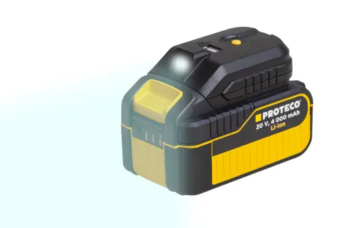 vstup 20 V; pro akumulátor PROTECO Li-Ion 2000 mAh a 4000 mAh; výstup - USB-A 5 V pro nabíjení telefonu, tabletu či kamery; možnost LED svítilny; akumulátor a nabíječka nejsou součástí balení; hmotnost 110 g