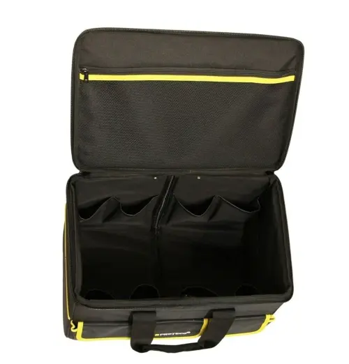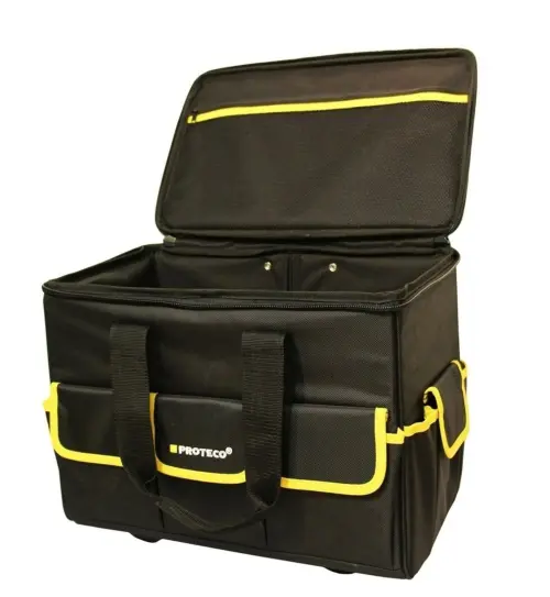 Brašna pracovní na kolečkách Proteco s objemem 42 litrů je vhodná pro všechny kutily. Díky 2 kolečkám, teleskopickému madlu a bočním pogumovaným rukojetím se dá s brašnou snadněji manipulovat. Dno brašny je zesílené. Různé velikosti kapes i pružných popruhů umožňují univerzální uložení různého nářadí. Celá brašna je přizpůsobena i pro práci v rukavicích. Brašna obsahuje vnitřní a vnější kapsy, zavírání víka ocelovým zipem. Délka teleskopického madla složeného je 35 cm, rozloženého 91 cm.