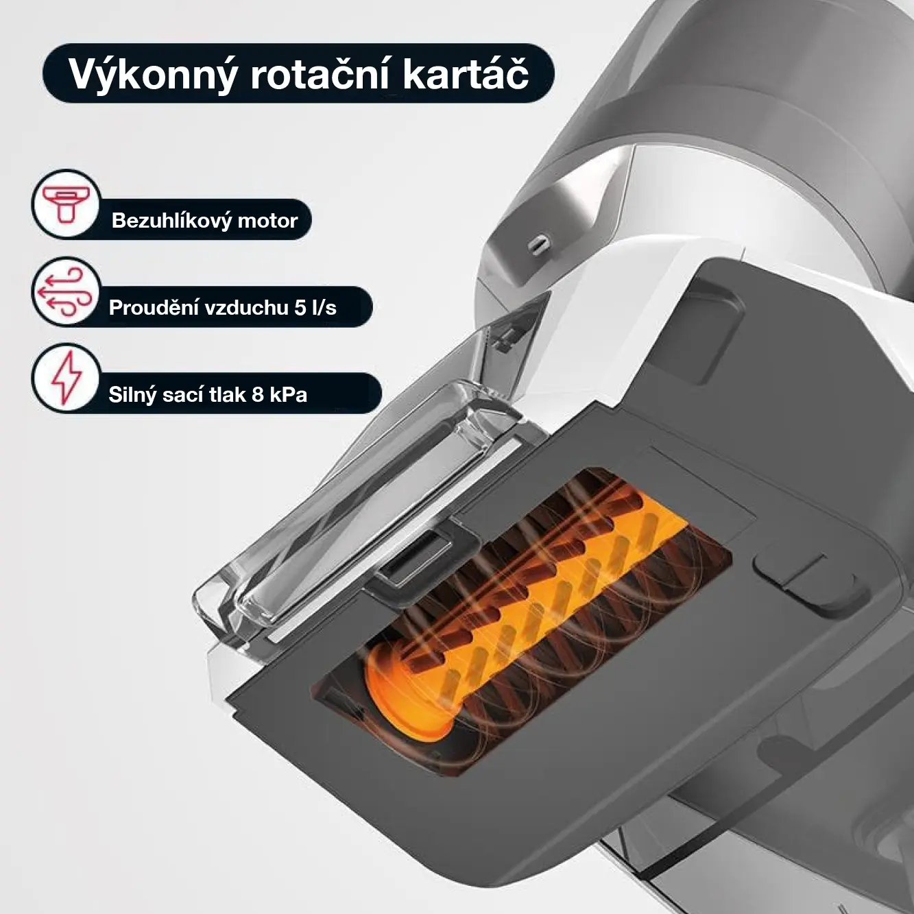 Díky čisticí směsi ve spreji a možnosti aktivace kartáče je každé čištění jednoduché a účinné. Optimalizovaný překvapivý výkon 60 W v kombinaci s baterií o kapacitě 2000 mAh zajišťuje dlouhou výdrž na jedno nabití, zatímco 300 ml nádržka na čisticí směs a 500 ml na špinavou vodu umožňují pohodlné čištění bez častého doplňování.
