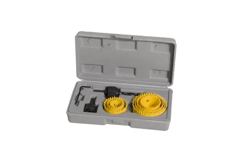 Sada vykružovacích pil z rychlořezné oceli (HSS) v kufru. Sada je určena pro vrtání do měkkého i tvrdého dřeva a sádrokartonu. Součástí sady je i držák vykružovacích pil se šestihrannou stopkou.