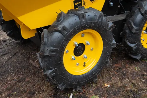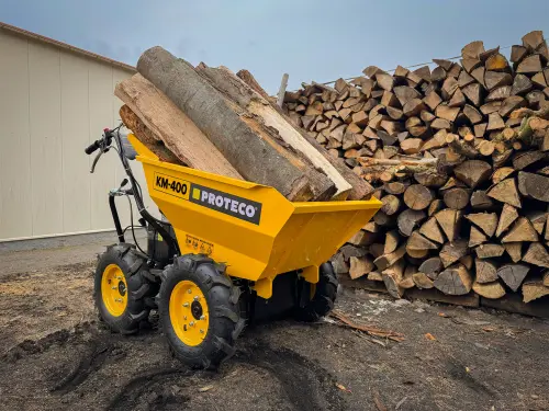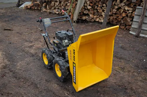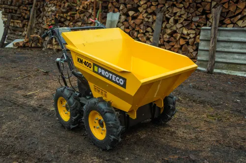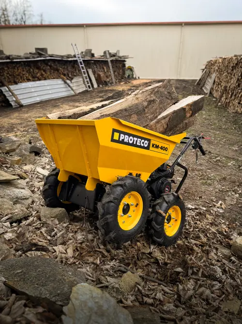 Motorový dumper PROTECO je neocenitelný pomocník na stavbě, v zemědělství, lesnictví i při úpravě zahrady. Díky nosnosti 400 kg bez námahy převeze těžký náklad i v extrémních podmínkách. Výkonný benzínový motor 5,5 HP (196 cm³) v kombinaci s pohonem všech kol (4x4) s přehledem překonává svahy (až do 20°), bahno i nerovnosti, , zatímco široká kola chrání podklad a zvyšují stabilitu.