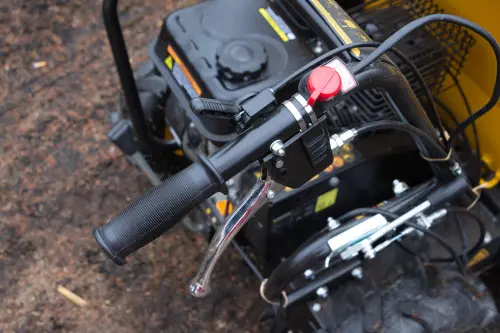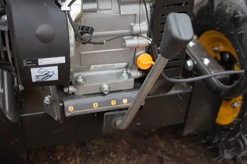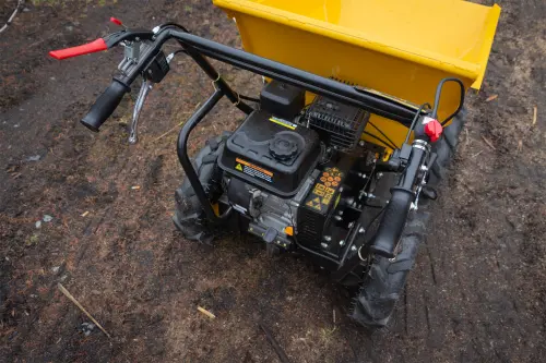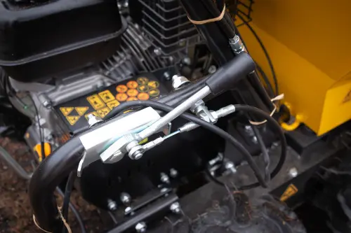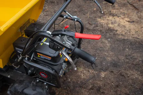 Obsluha dumperu je maximálně intuitivní. Páčky na rukojeti umožňují snadné řízení, přidávání plynu i zastavení. Třístupňová převodovka + zpátečka zajišťuje plynulou jízdu, přičemž automatická brzda se aktivuje při uvolnění plynu, takže máte vždy plnou kontrolu nad strojem.
