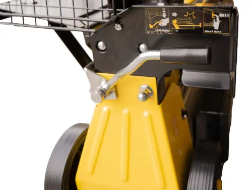 Bezpečnost na prvním místě: Štípačka splňuje nejnovější evropské bezpečnostní normy. Ovládání pístu dvěma pákami zabraňuje úrazům, které by mohly vzniknout při ovládání jednou rukou. Navíc je vybavena ochrannou klecí, která zamezuje úrazům spojeným s vymrštěním štípaného polena.