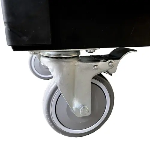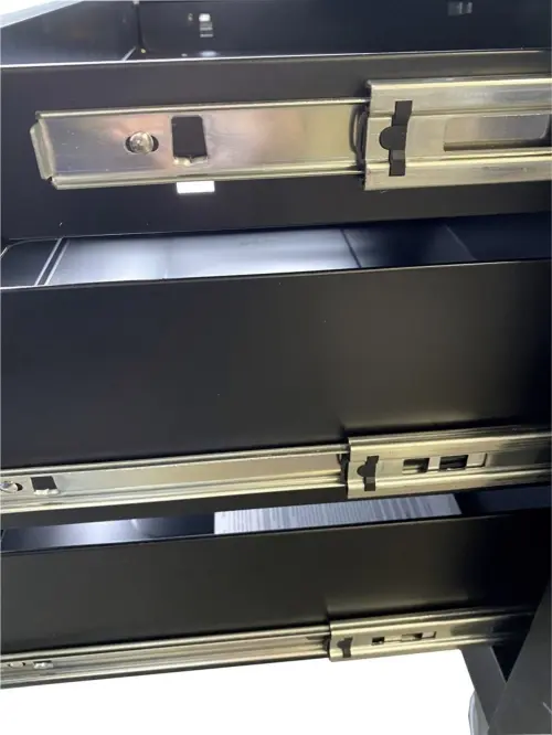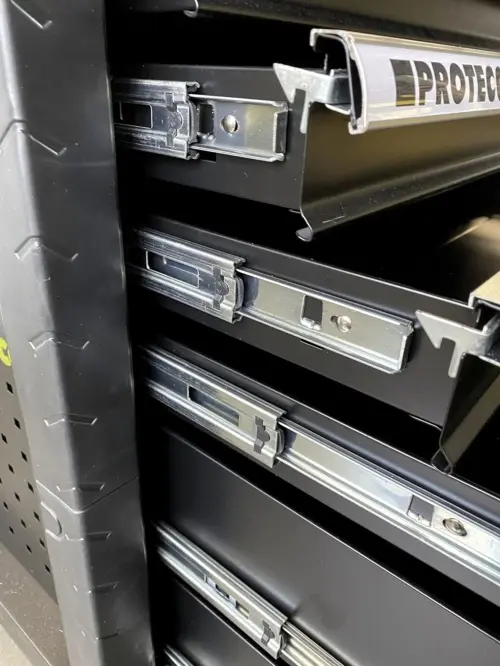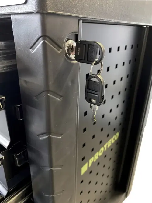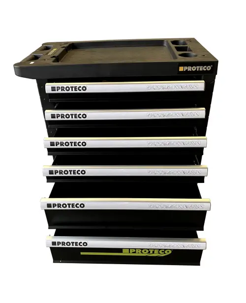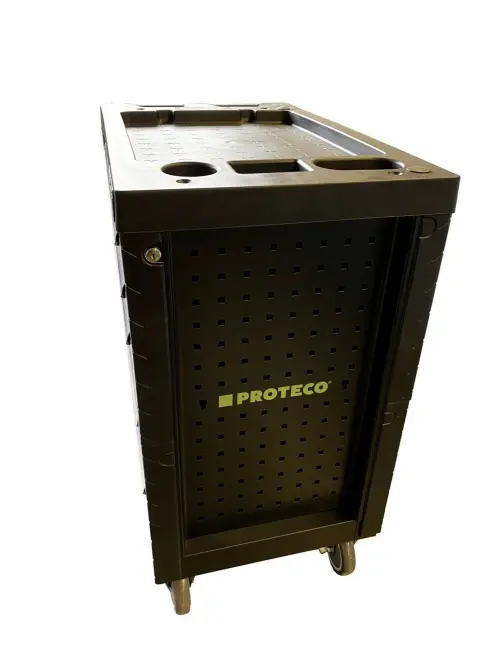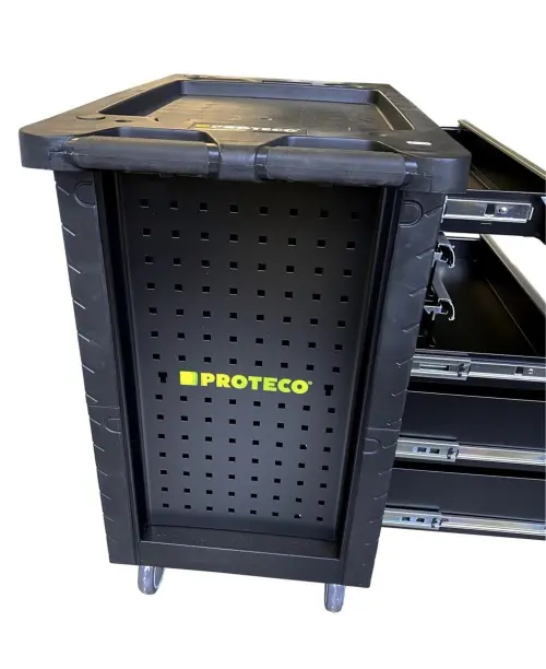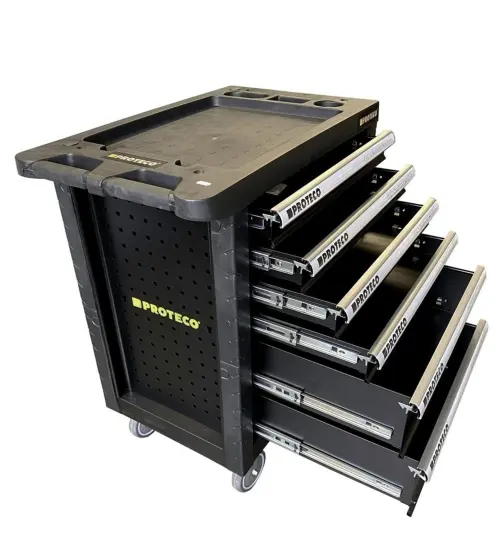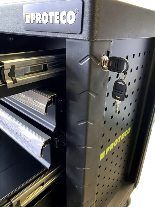 Vozík dílenský PROTECO s pojezdovými koly slouží pro ukládání drobného nářadí nebo nástrojů. Je osazen šesti zásuvkami. Všechny zásuvky se vysouvají na ocelových lištách opatřených kuličkovými ložisky. Každá zásuvka je aretovaná proti samovolnému vysunutí. Zásuvku lze otevřít pouze tahem za čelní rukojeť, kdy stlačením lišty v rukojeti dojde k odjištění zásuvky. Pro zamezení přístupu nepovolaným osobám k nářadí slouží zámek umístěný na boční straně vozíku. Lze jím centrálně uzamknout všech 6 zásuvek najednou. Horní deska o rozměrech 484 x 385 mm je z tvrzeného plastu a je možné ji využít jako pracovní stolek pro drobné montážní práce. K odložení drobných dílů slouží 3 prolisy v pracovní desce. Součástí desky jsou i dvě rukojeti pro manipulaci se skříní. Pro usnadnění transportu je skříň osazena čtyřmi koly s pryžovými obručemi. Pryžové obruče snižují vibrace i hlučnost při transportu. Dvě kola jsou pevná a dvě otočná s aretovanými brzdami. Sešlápnutím brzd je možné zajistit skříň proti pohybu. Bočnice skříně jsou opatřeny univerzálním perforováním, na které je možné osadit háčky nebo držáky a navýšit tak úložnou kapacitu. Hrany skříně jsou chráněny proti poškození plastovými rohovými nárazníky.