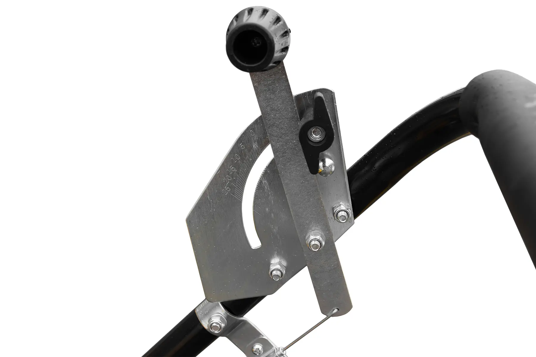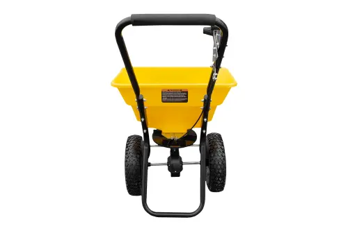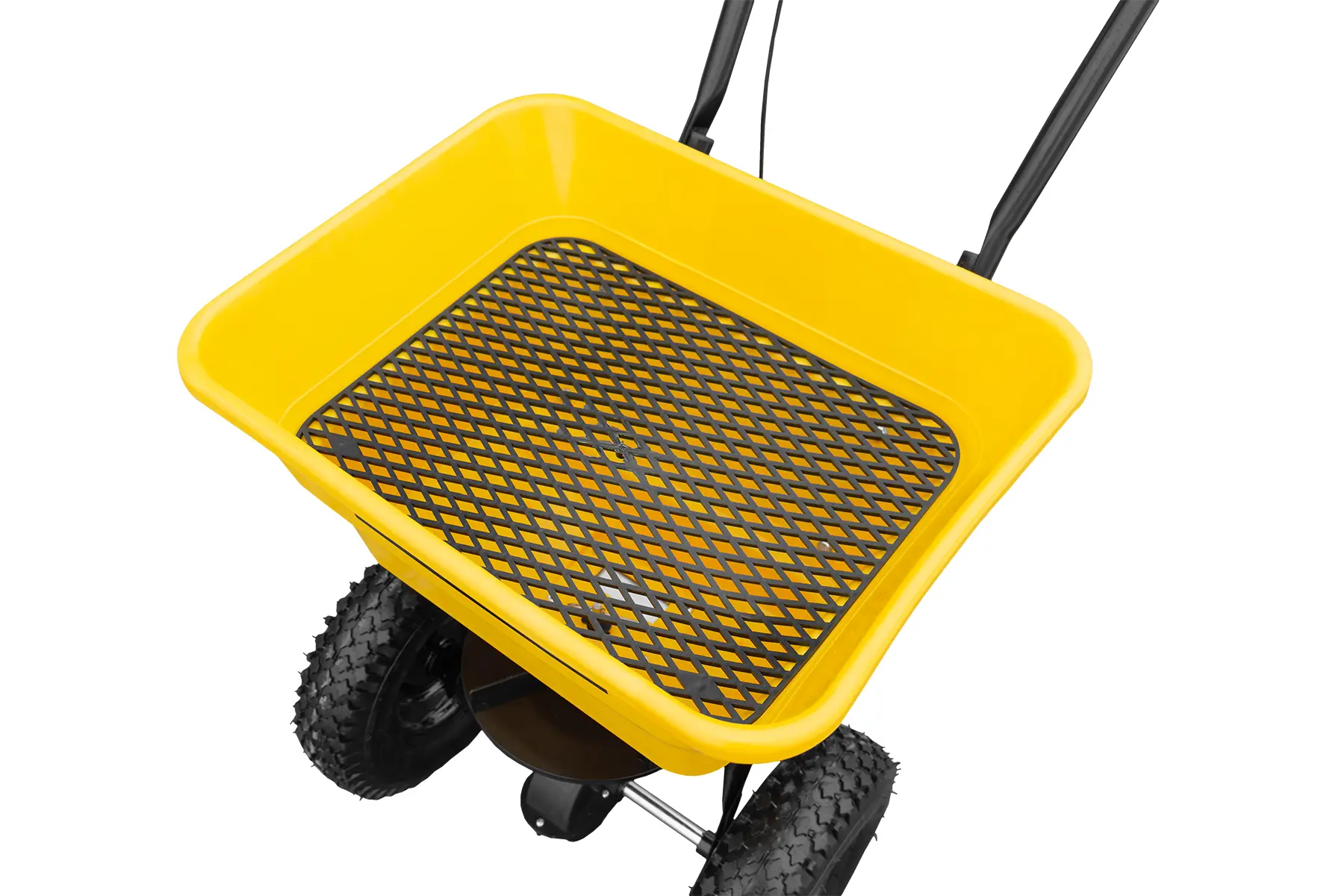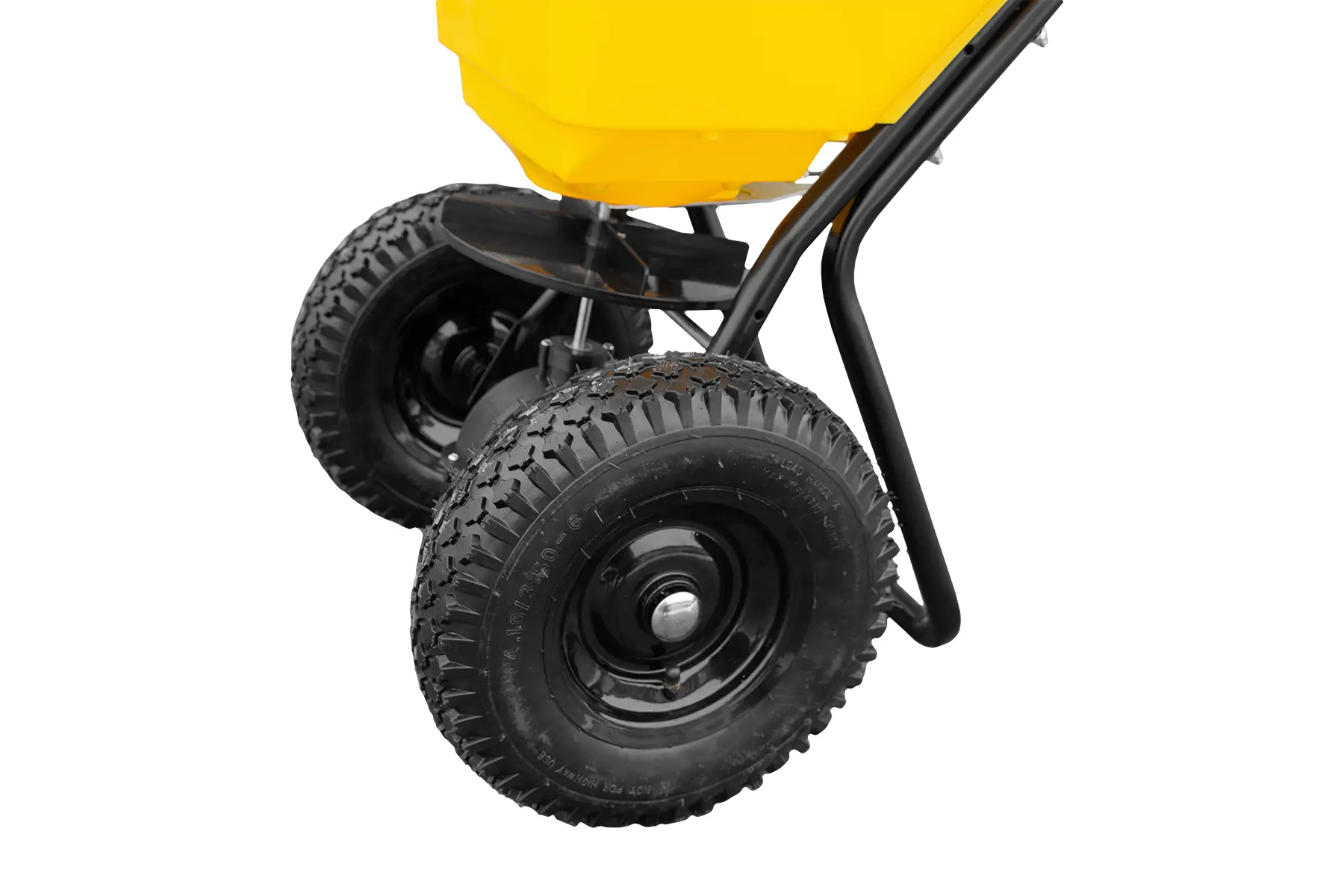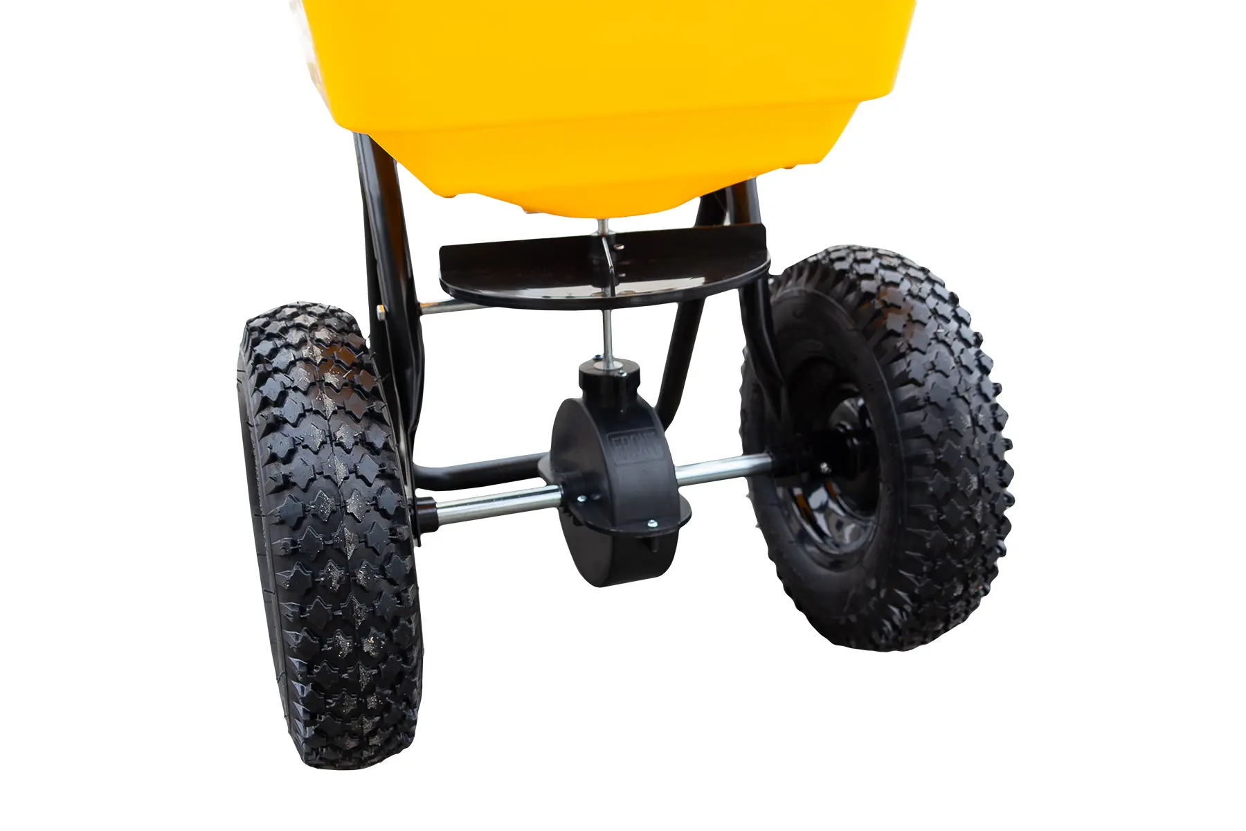 Plynulá regulace dávkování posypu umístěná přímo na rukojeti umožňuje přesné nastavení množství materiálu podle aktuální potřeby, a to pohodlně během jízdy bez nutnosti zastavování. Díky tomu je posyp rovnoměrný, úsporný a pod kontrolou po celé ploše, a to až do pracovní šířky 2 metrů. Velká 12 palcová kola zajišťují plynulý pojezd i na nerovném povrchu. Pracovní výška 82 cm v kombinaci s měkčeným madlem rukojeti zvyšuje komfort obsluhy a snižuje únavu při delší práci.