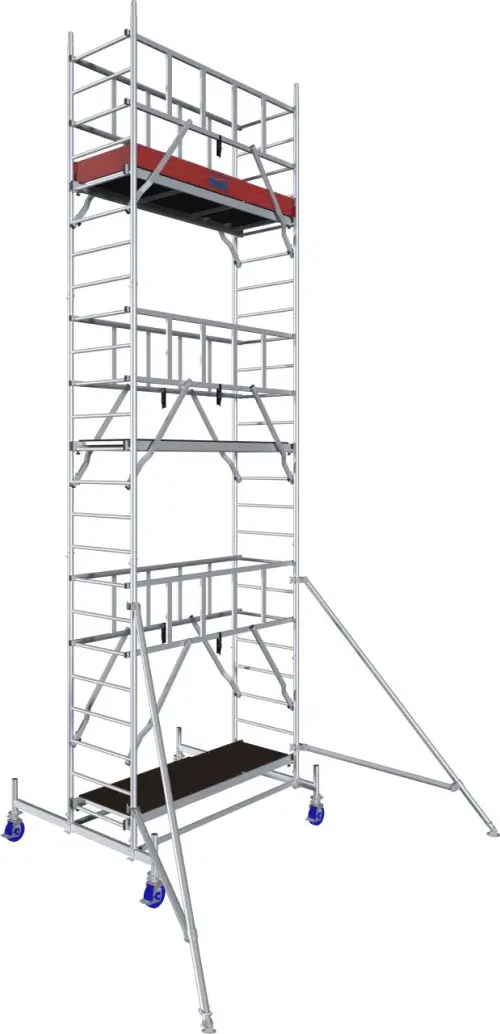 Plošina o rozměru 2 x 0,6 m je tvořena z klimaticky odolné protiskluzové desky z fenolové pryskyřice, což zamezuje uklouznutí a zajišťuje maximální životnost lešení. Lešení je dále vybaveno výškově nastavitelnými, brzděnými pojezdovými kolečky, které oceníte zejména pro snadný přesun lešení a také možnost vyrovnat výškové rozdíly na nerovném terénu. Vysokopevnostní ocelový stabilizátor poskytuje nadstandardní stabilitu celé konstrukci.