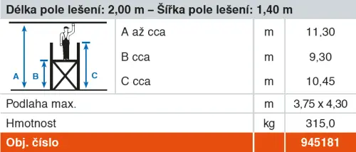 PROTEC XXL; široké provedení; výška lešení 10,45 m; pracovní výška 11,3 m; hmotnost 315 kg