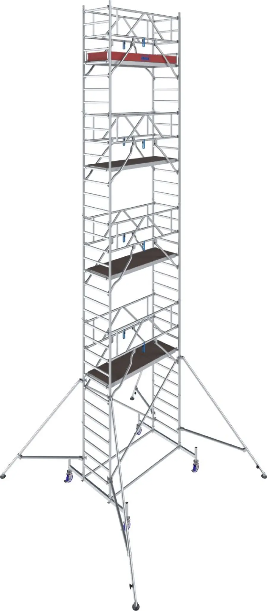 Od výšky 4,40 m jsou součástí ocelové stabilizátory, od 7,40 m pak i teleskopické výložníky s nastavitelnými patkami pro vyšší stabilitu. Kolečka s nastavitelnou výškou (Ø 150 mm) usnadňují přesun i práci na nerovném terénu.
