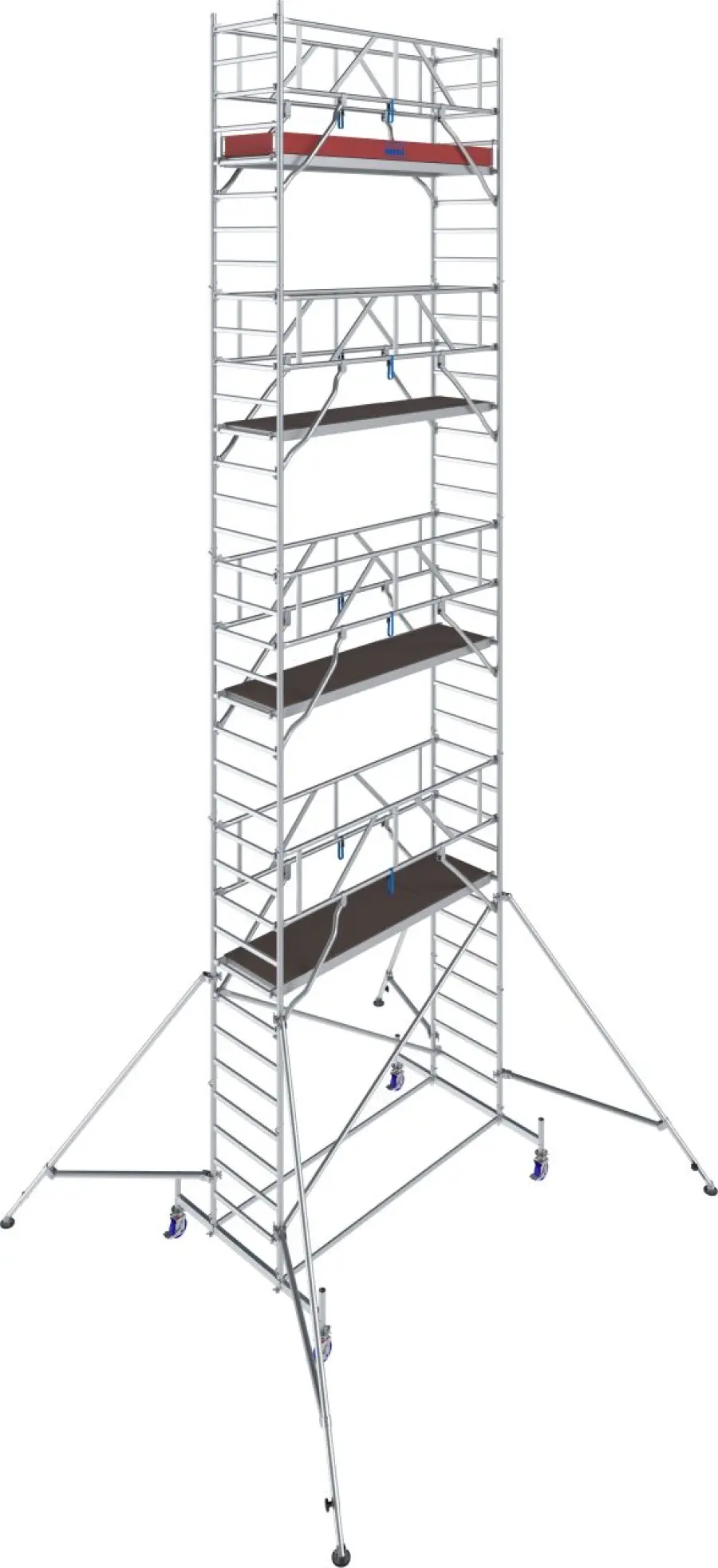 Od výšky 4,40 m jsou součástí ocelové stabilizátory, od 7,40 m pak i teleskopické výložníky s nastavitelnými patkami pro vyšší stabilitu. Kolečka s nastavitelnou výškou (Ø 150 mm) usnadňují přesun i práci na nerovném terénu.