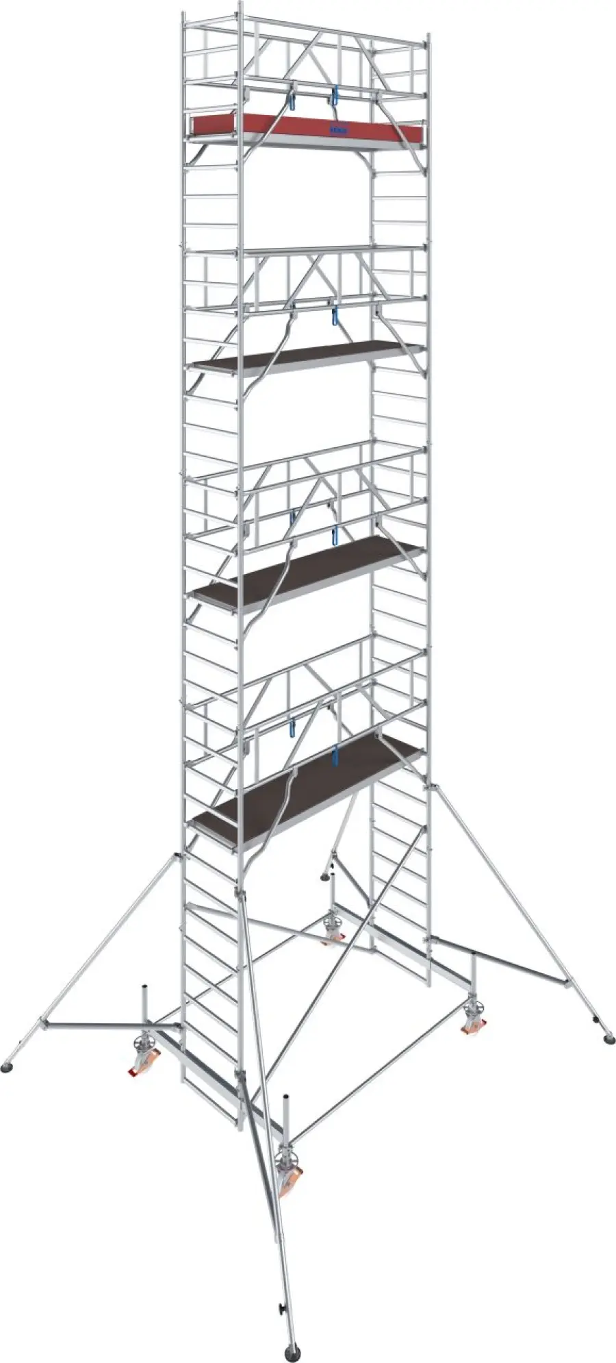Výškově stavitelná kolečka Ø 200 mm se šroubovým mechanismem umožňují vyrovnání i na nerovném podkladu. Pro vyšší konfigurace (od cca 7,50 m) se používají teleskopické výložníky pro bezpečnou stabilizaci; pro tuto 4,50 m sestavu nejsou potřeba.Klíčové vlastnosti: