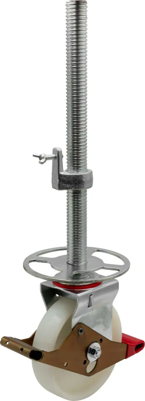 Výškově stavitelná kolečka Ø 200 mm se šroubovým mechanismem umožňují vyrovnání i na nerovném podkladu. Pro vyšší konfigurace (od cca 7,50 m) se používají teleskopické výložníky pro bezpečnou stabilizaci; pro tuto 4,50 m sestavu nejsou potřeba.