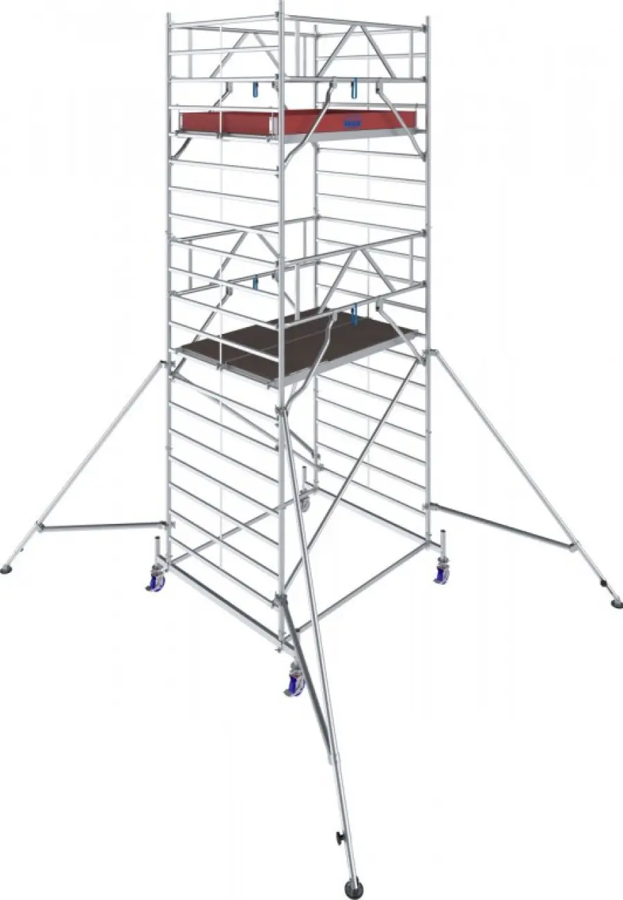 Od výšky 4,40 m jsou součástí ocelové stabilizátory, od 6,40 m pak i teleskopické výložníky s nastavitelnými patkami pro vyšší stabilitu. Kolečka s nastavitelnou výškou (Ø 150 mm) usnadňují přesun i práci na nerovném terénu.