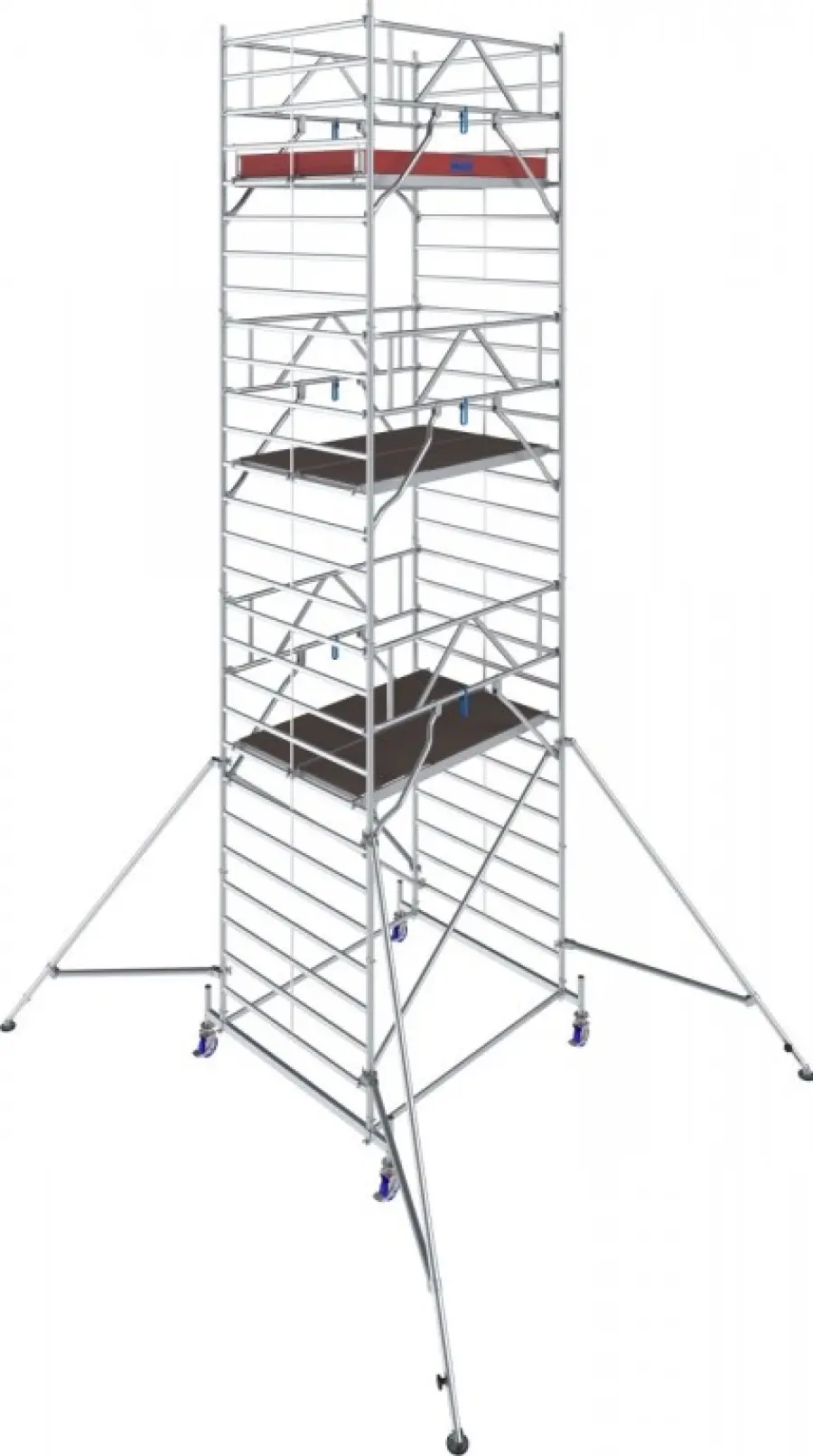 Od výšky 4,40 m jsou součástí ocelové stabilizátory, od 6,40 m pak i teleskopické výložníky s nastavitelnými patkami pro vyšší stabilitu. Kolečka s nastavitelnou výškou (Ø 150 mm) usnadňují přesun i práci na nerovném terénu.